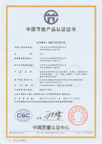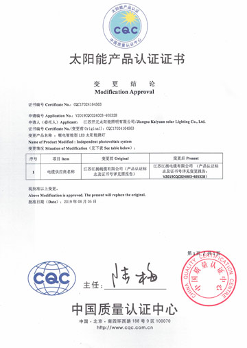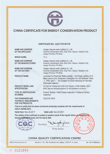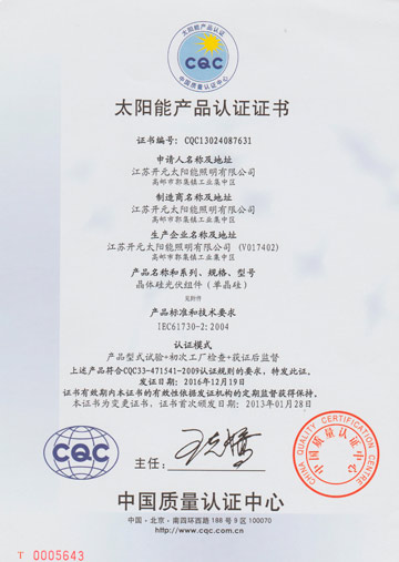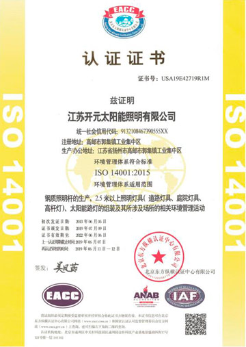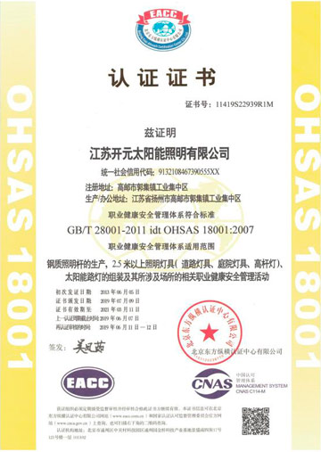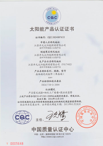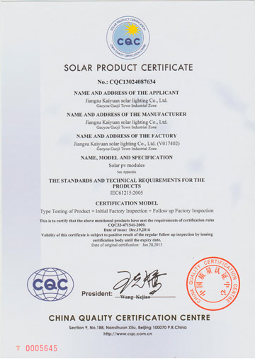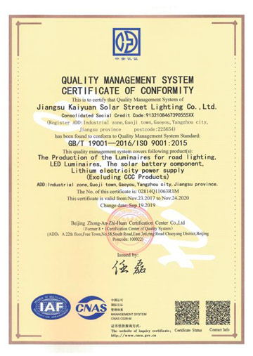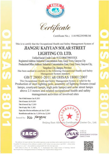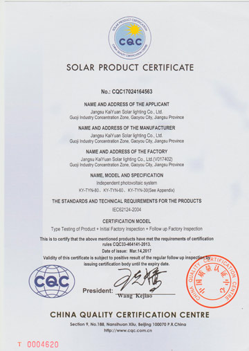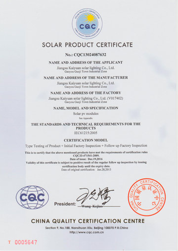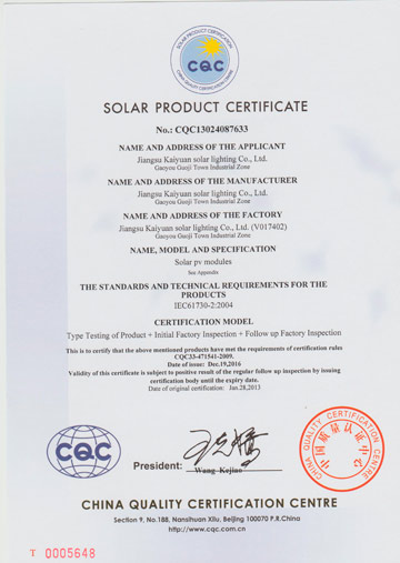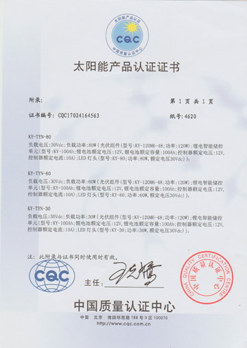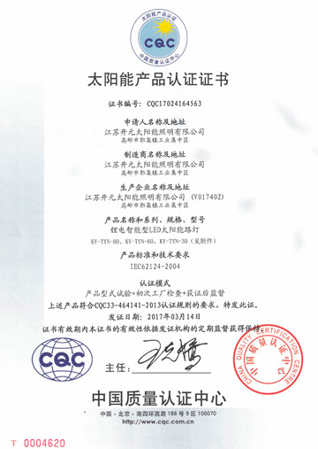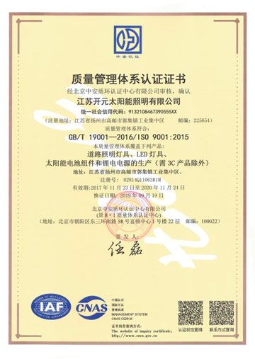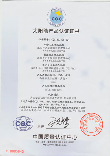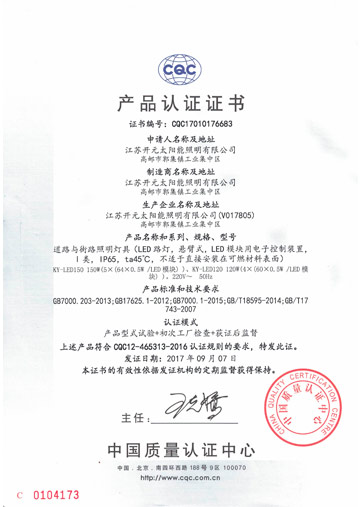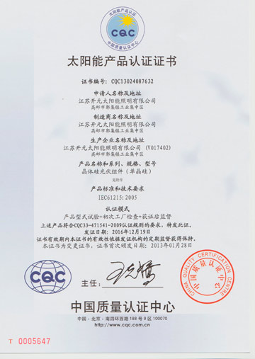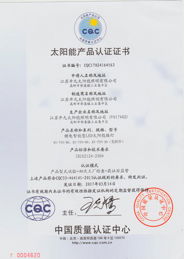 開元太陽能照明于2009年通過了ISO9001產(chǎn)品質(zhì)量體系認證、環(huán)境管理體系14001認證、職業(yè)健康與安全管理體系18001認證,太陽能路 燈CQC認證、金太陽認證、CE證書、RoHS認證、TUV認證及世界多個國家認可的鋰電池、太陽能路燈整套系統(tǒng)的CB認證證書,多項產(chǎn)品通過了:lEC60598-2017、IEC61215:2016、IEC62619:2017、IEC61427等檢測,公司產(chǎn)品同時獲得了多項第三方機構(gòu)的檢測報告,成為了“國際研究機構(gòu)推薦的太陽能路燈市場主要參與者”。