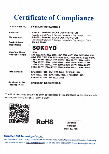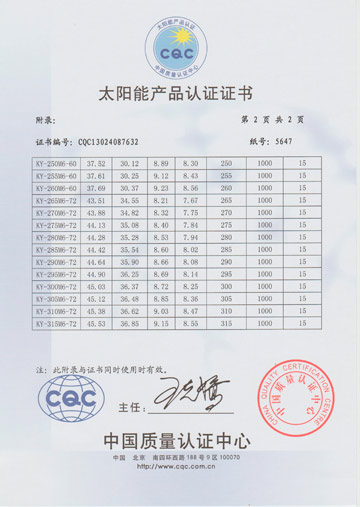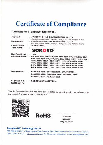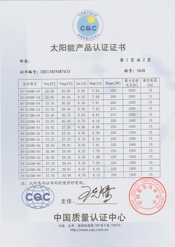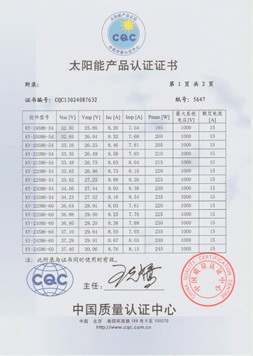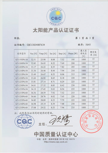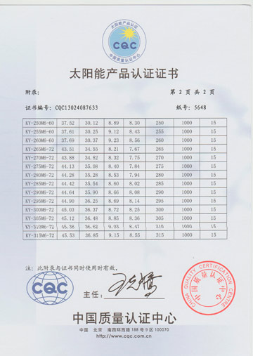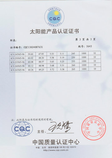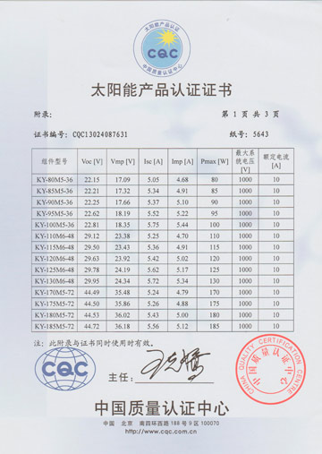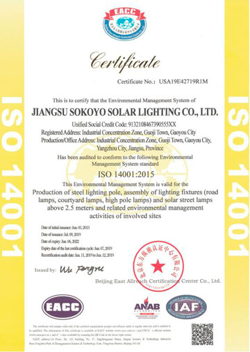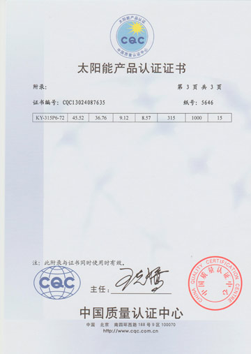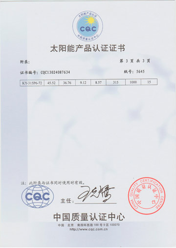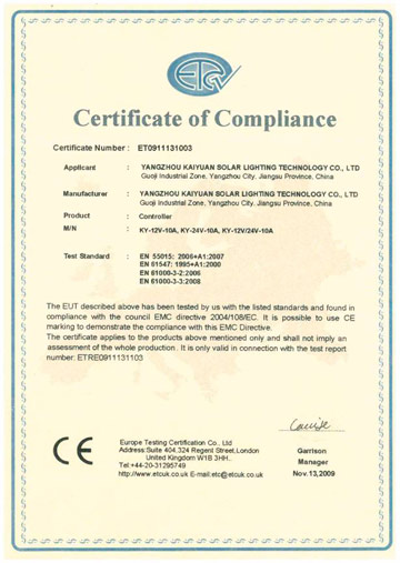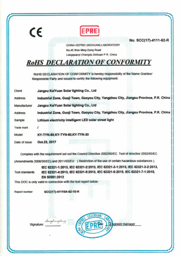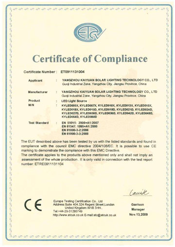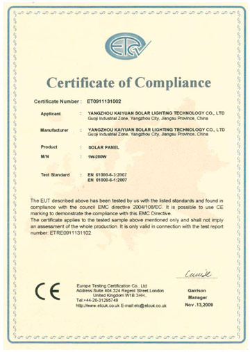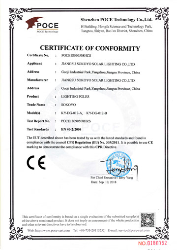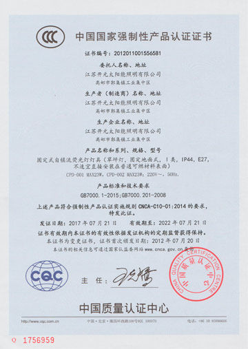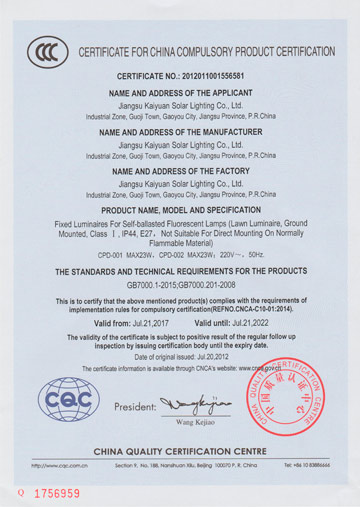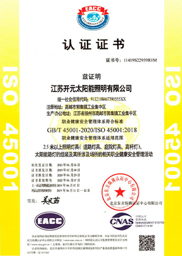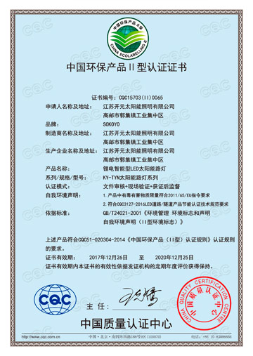 開元太陽能照明于2009年通過了ISO9001產(chǎn)品質(zhì)量體系認證、環(huán)境管理體系14001認證、職業(yè)健康與安全管理體系18001認證,太陽能路 燈CQC認證、金太陽認證、CE證書、RoHS認證、TUV認證及世界多個國家認可的鋰電池、太陽能路燈整套系統(tǒng)的CB認證證書,多項產(chǎn)品通過了:lEC60598-2017、IEC61215:2016、IEC62619:2017、IEC61427等檢測,公司產(chǎn)品同時獲得了多項第三方機構(gòu)的檢測報告,成為了“國際研究機構(gòu)推薦的太陽能路燈市場主要參與者”。