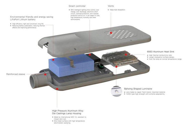 金星二合一太陽能路燈采用高效LED模塊、防水燈殼、長壽命鋰電池和智能太陽能充電控制器。